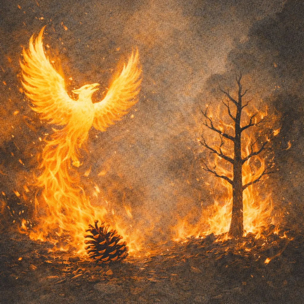 A forest fire burns so the pinecone can open.